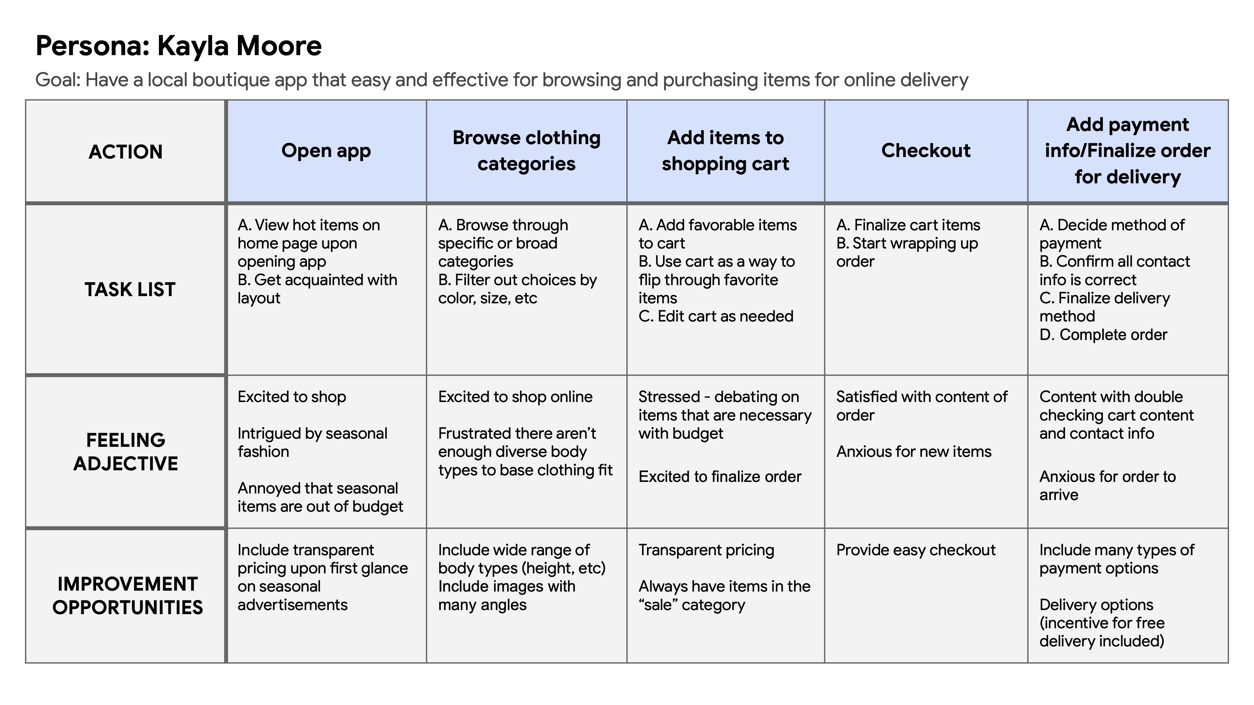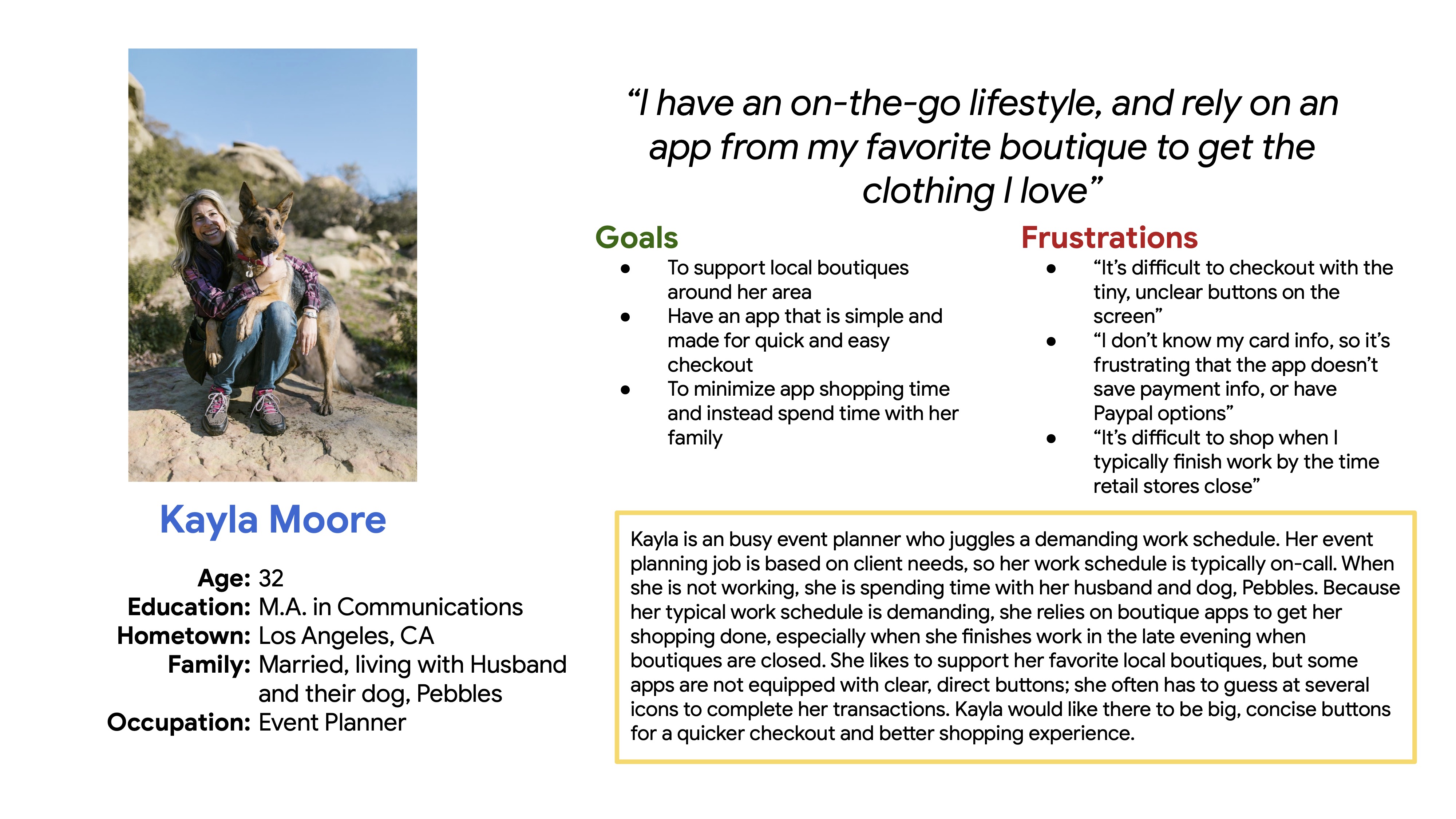 Mapping Kayla’s journey revealed how helpful it would be for users to have a clothing app that had accurate sizing and an easy checkout process.