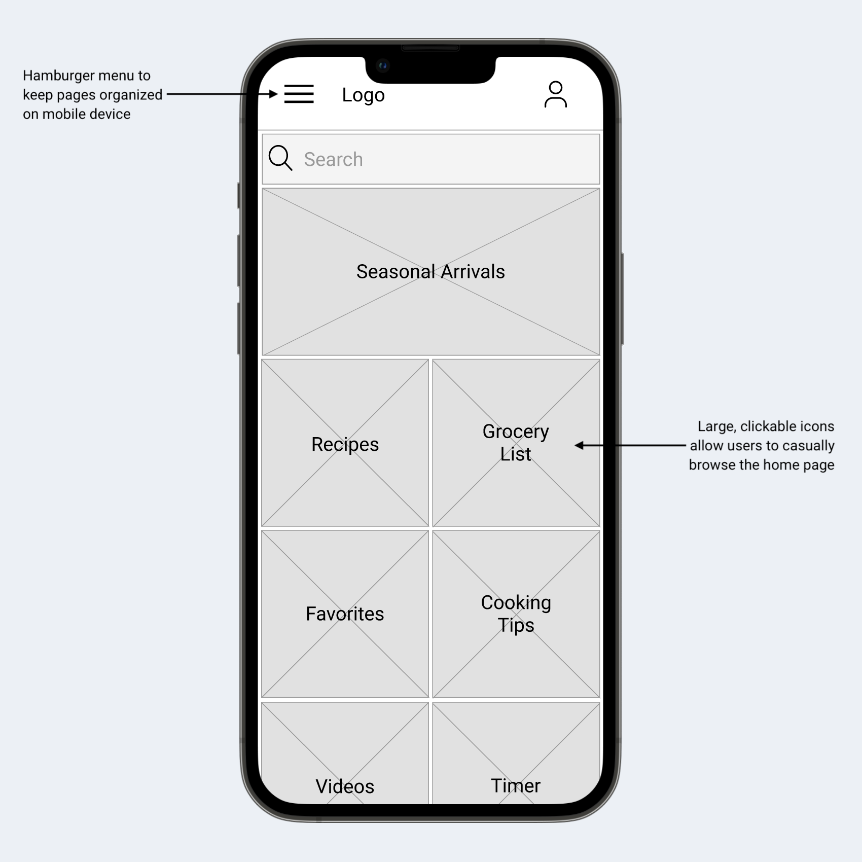 After sketching many different ideas for the home page, I decided on a design with big, bold images to keep users engaged with the app.