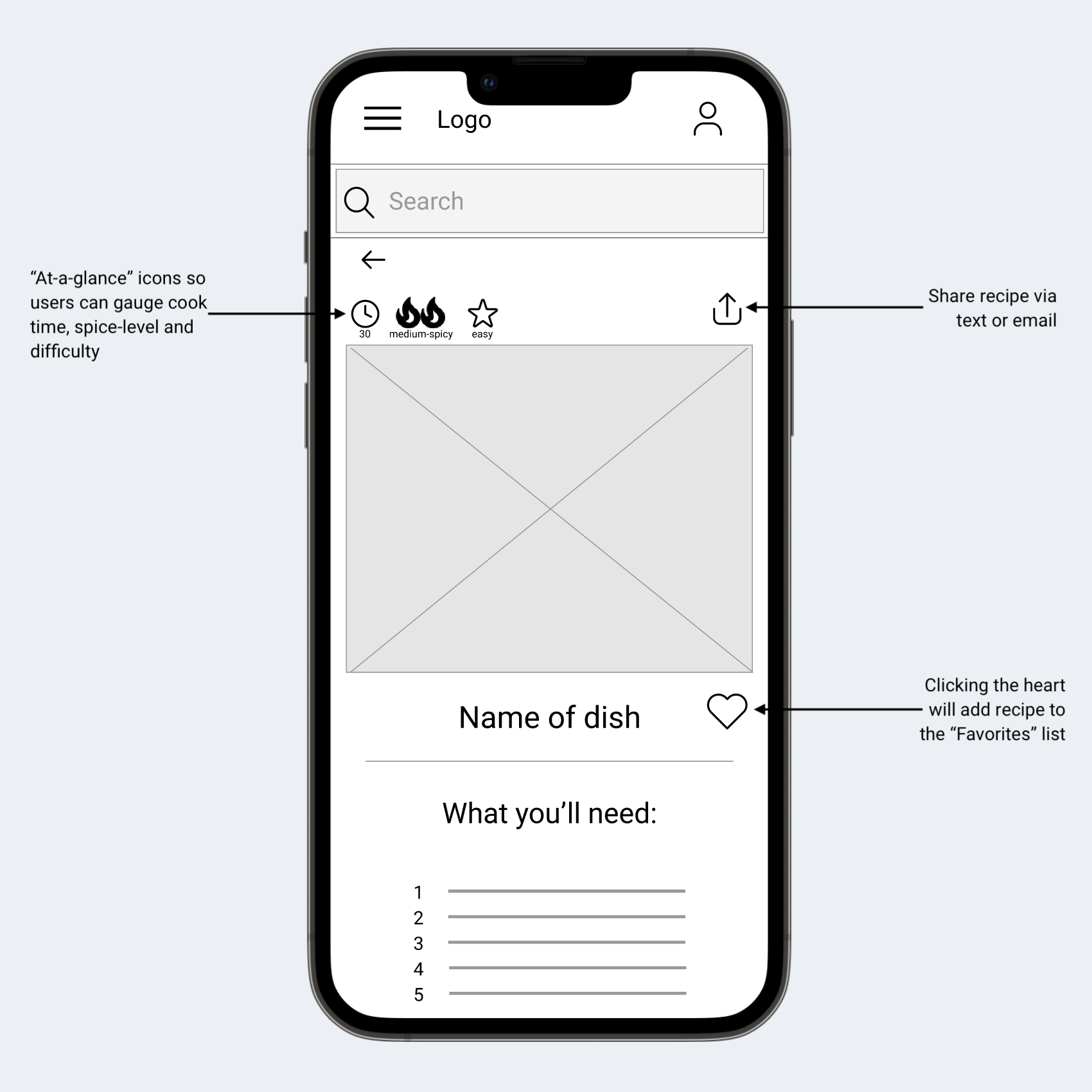 The icons at the top of the app allow for users to understand very quickly what the recipe entails. The additional "share" and "favorite" icon are present to allow users to access them for later use.
