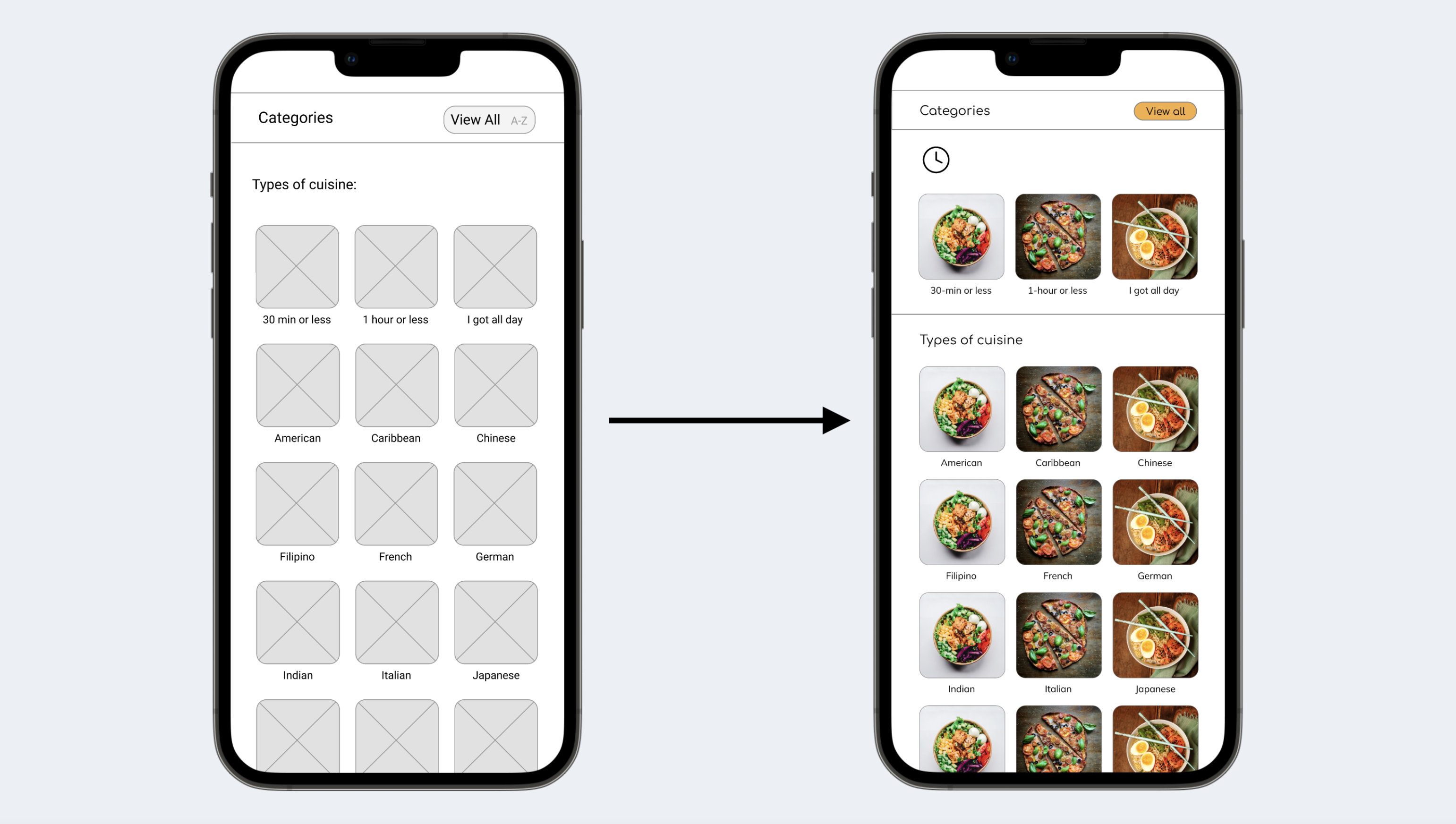 Originally, I had the category of time grouped in with the rest of the types of cuisine, which users overlooked and expressed wanting a more definitive space for timed meals. In the second mockup, I included a separate space for this.