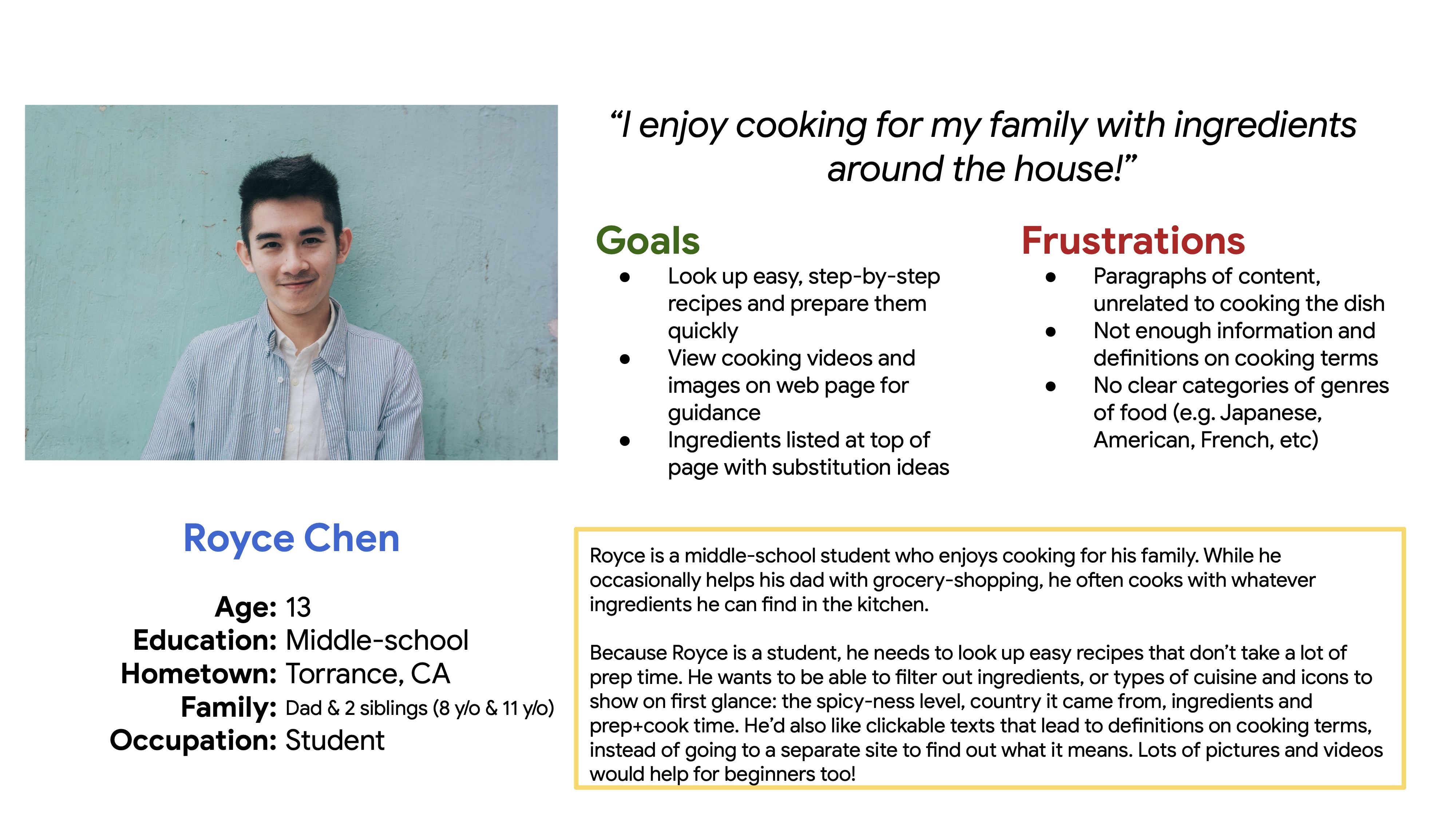Royce Chen is a middle-school student who enjoys cooking, who needs to access healthy recipes with quick & easy step-by-step instructions with lots of pictures and videos because he’d like to make them on his own for his family.