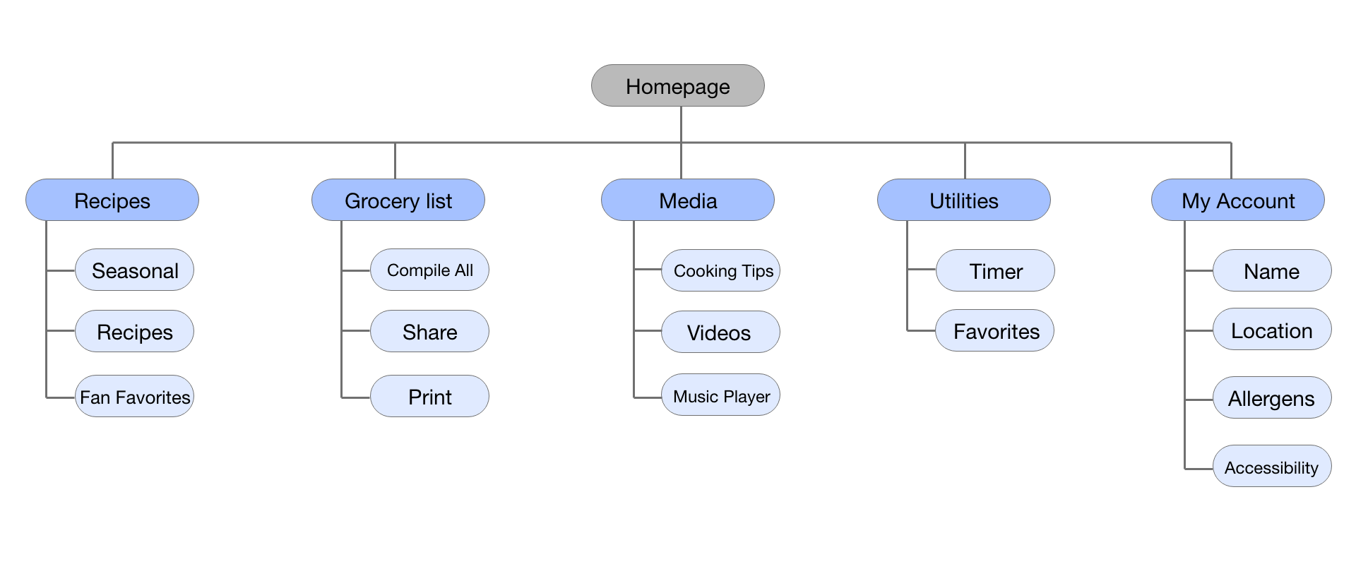 I used the original dedicated mobile app structure to help guide the sitemap for the website application. The structure generally remained the same, but I further compiled the child tabs to fit under parent tabs in broader categories, for a clean look. (IA from the mobile device remained similar for a tablet application).