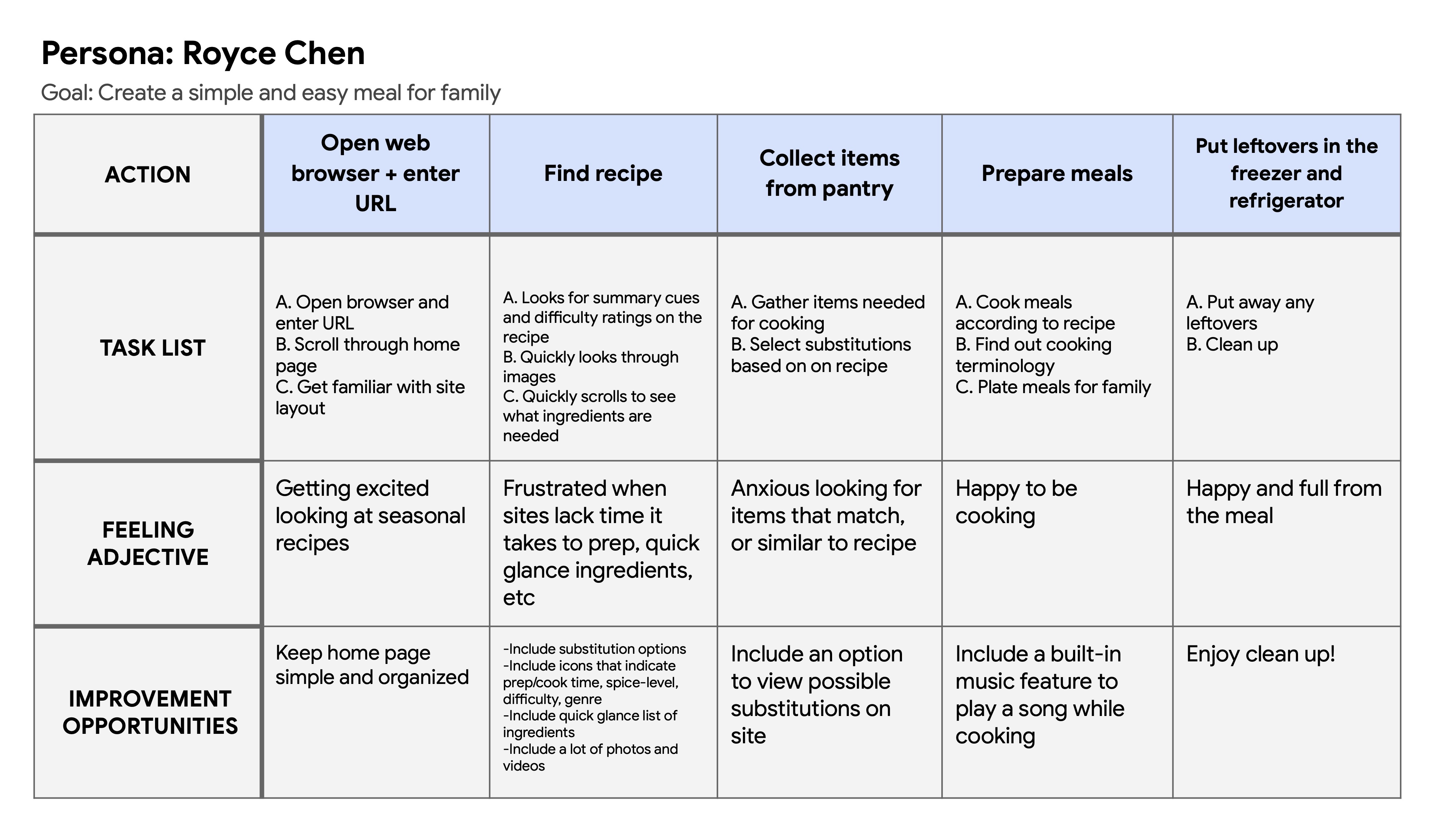 Mapping Royce's journey revealed how helpful it would be to have images and videos for each step, as well as providing cues on the approximate cook time.
