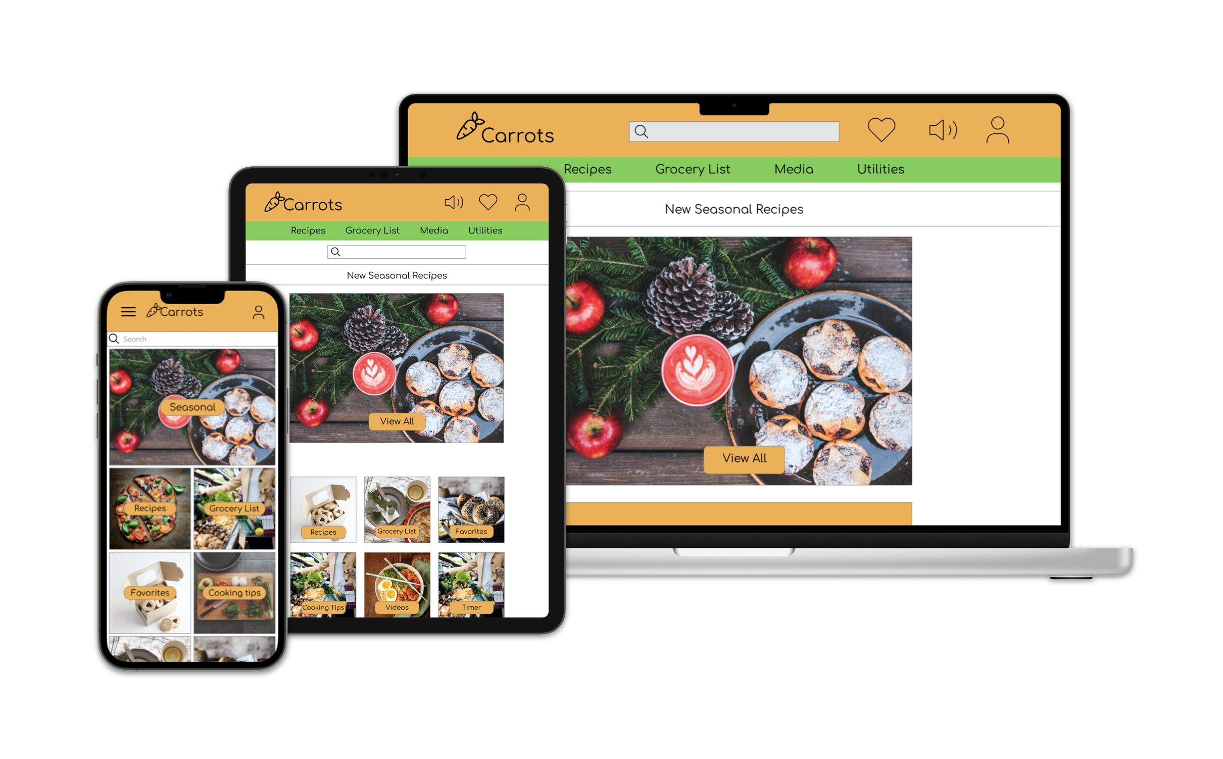 Although I had more space to play with for the tablet and desktop designs, I wanted to keep negative space around it so images, text and recipes were easy to read and view.